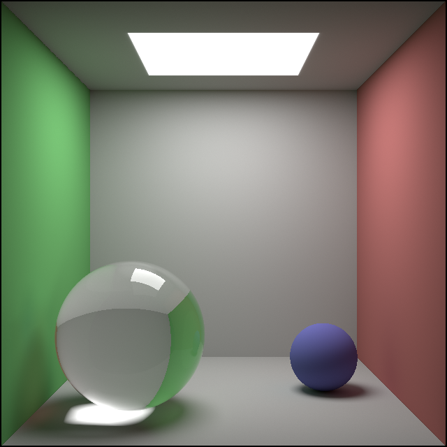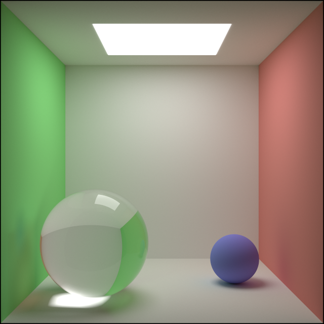 This time I am adding transparent materials to my ray tracer and use it to simulate a glass ball in the Cornell box scene. Transparent Material So far I only had once kind of material; diffuse. To model glass I need a new kind of material that describes how light rays can pass through the object. First of all let’s introduce an abstraction for a medium. struct Medium { float ior; ///< Index of refraction }; For now it only describes the index of refraction, which I will use to figure out how light rays refract when crossing boundaries, but later I can use it to add support for volumetric rendering such as fog. ...