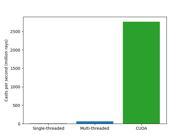 The rendered images look good but it takes an awful lot of time to create them. Adding more effects later will make it even slower, so I want to take a look into using more of my computer’s resources to render. Single-threading The renderer currently uses a single CPU core. To assess the speed gains I wrote some code to count the number of ray casts performed per second. In the single-threaded version that works out to be 9.1 million ray casts per second. ...